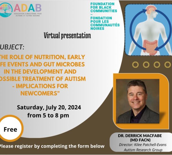 SUJET: “LE RÔLE DE LA NUTRITION, DES ÉVÉNEMENTS DE DÉBUT DE VIE ET DES MICROBES INTESTINAUX DANS LE DÉVELOPPEMENT ET LE TRAITEMENT POSSIBLE DE L’AUTISME – IMPLICATIONS POUR LES NOUVEAUX ARRIVANTS”
